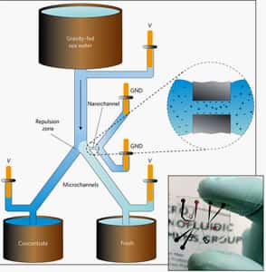 Neste novo método, que já tem sido utilizado para outros fins, a água com carga iónica, salgada, passa por um nano-canal. Ao longo do canal existe uma voltagem que repele as partículas com carga. Isto faz com que o líquido se separe, criando dois fluxos, um com carga e outro com partículas neutras.